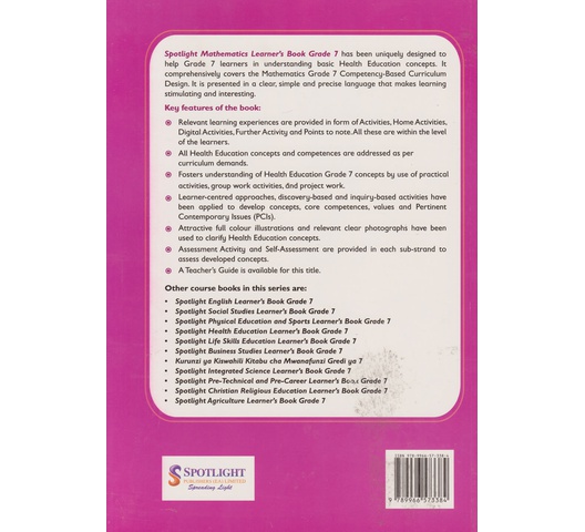 Spotlight Mathematics Learner’s Book Grade 7 has been uniquely designed to help Grade 7 learners in understanding basic Health Education concepts. It comprehensively covers the Mathematics Grade 7 Competency-Based Curriculum Design. It is presented in a clear, simple and precise language that makes learning stimulating and interesting.