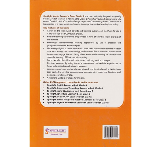 Spotlight Music Learner’s Book Grade 6 has been uniquely designed to greatly ,benefit Grade 6 learners in handling the Grade 6 Music Curriculum. It comprehensively covers Grade 6 Music Curriculum Design as per the Competency-Based Curriculum. It is presented in a clear, simple and precise language that makes learning interesting.