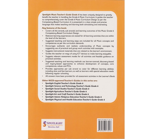 Spotlight Music Teacher’s Guide Grade 6 has been uniquely designed to greatly benefit the teacher in handling the Grade 6 Music Curriculum. It guides the teacher to comprehensively cover the Grade 6 Music Curriculum Design as per the Competency Based Curriculum. It is presented in a clear, simple and precise language that makes teaching and learning both stimulating and interesting.