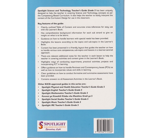 Spotlight Science and Technology Teacher’s Guide Grade 5 has been uniquely designed to help the teacher in covering Science and Technology concepts as per the Competency-Based Curriculum. It also helps the teacher to easily interpret the content of the Curriculum Design for use in the classroom.