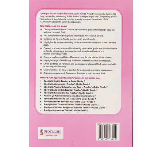 Spotlight Social Studies Teacher’s Guide Grade 7 has been uniquely designed to help the teacher in covering Social Studies concepts as per the Competency-Based Curriculum. It also helps the teacher to easily interpret the content of the Curriculum Design for use in the classroom.