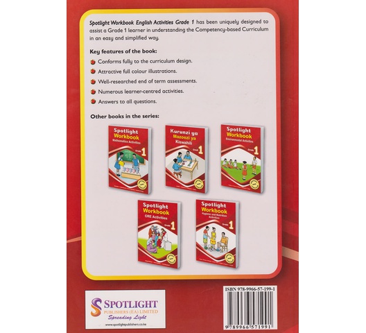 Spotlight Workbook English Activities Grade 1 has been uniquely designed to assist a Grade 1 learner in understanding Competency-based Curriculum in an easy and simplified way.