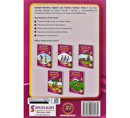 Spotlight Workbook Hygiene and Nutrition Activities Grade 2 has been: uniquely designed to assist a Grade 2 learner in understanding the Competency-Based Curriculum in an easy and simplified way.