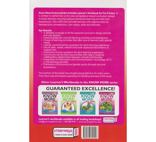 Know More Environmental Activities Learner’s Workbook for pre-primary 2 is written in conformity to the new competency-based curriculum design to assist learners carry out various interactive learning activities and experiences. This will, in turn, provide learners with opportunities to develop core competences, core values, skills and attitudes.