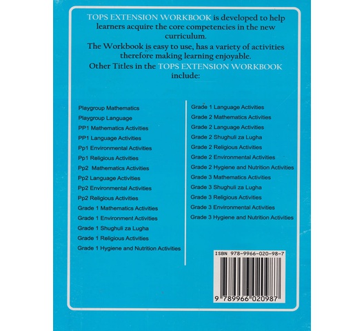 Tops Extension Environmental is developed to help learners acquire the core competencies in the new curriculum. The Workbook is easy to use, has a variety of activities therefore making learning enjoyable.