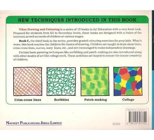 Vikas Drawing and Colouring is a series of 10 books in Art Education with a very fresh look. Prepared for students from KG to Secondary levels, these books are designed with a vision of the interests as well as needs of children at various stages.Book C, the third book in the series, provides graded colouring exercises for prep kids. What’s more, this book teaches the children the basics of drawing. Children are taught to draw slant lines, criss-cross lines, curves, wavy lines, etc., and are encouraged to make independent drawings.Certain basic painting techniques like scribbling and patch-making are also introduced along with other modes of art like collage work. These activities are hoped to arouse the innate creativity of children.
